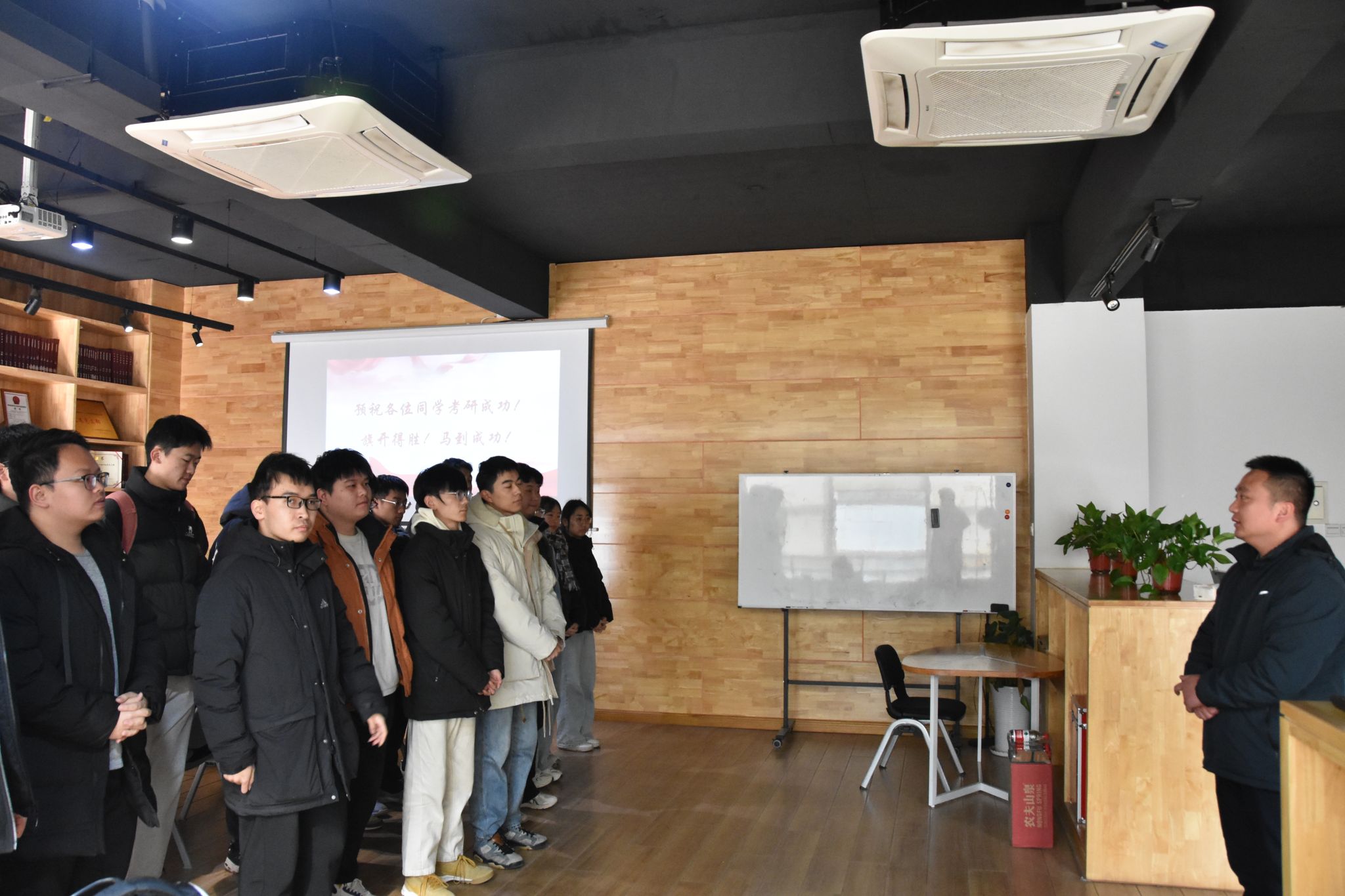 417会议室。同学们脸上既有期待也有紧张,但更多的是对未来的坚定信念。陈章政副书记和潘登辅导员带着学院全体师生的祝福,鼓励同学们保持积极心态,秉持严肃认真的态度,迎接即将到来的挑战。陈章政表示,考研是一次人生的重要考验,它不仅检验你们的知识水平,更考验你们的意志品质和心态调整能力。学院永远是你们最坚强的后盾,希望你们能够珍惜这次机会,以最佳的状态迎接考试,不负青春,不负韶华。