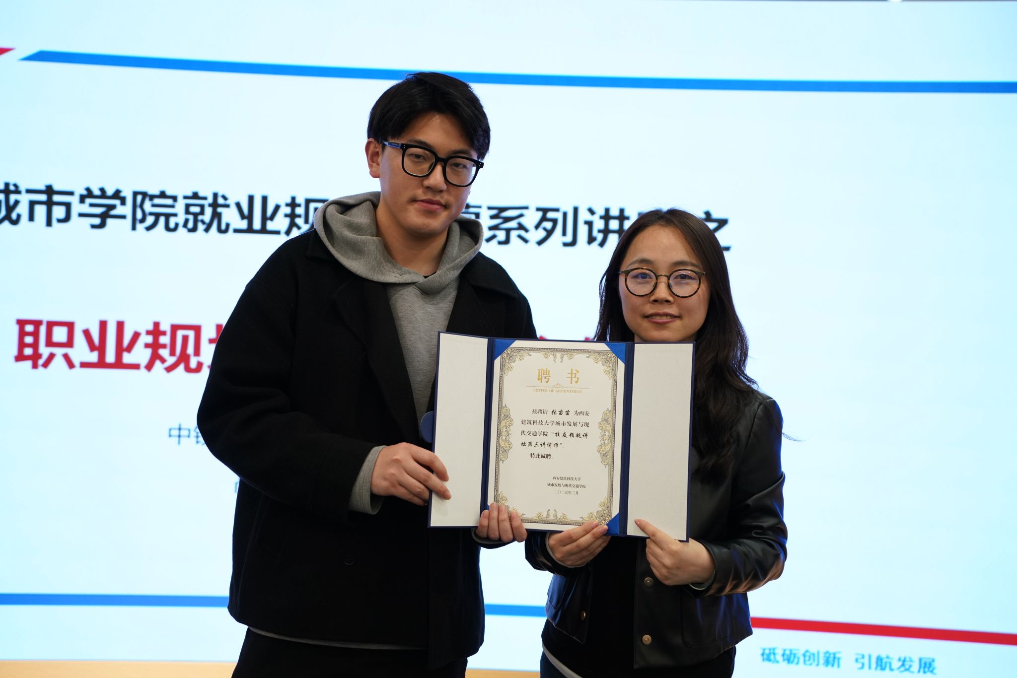 讲座最后,华林炜代表学院为张苗苗颁发了“校友领航讲坛(第三讲)讲师”聘书。