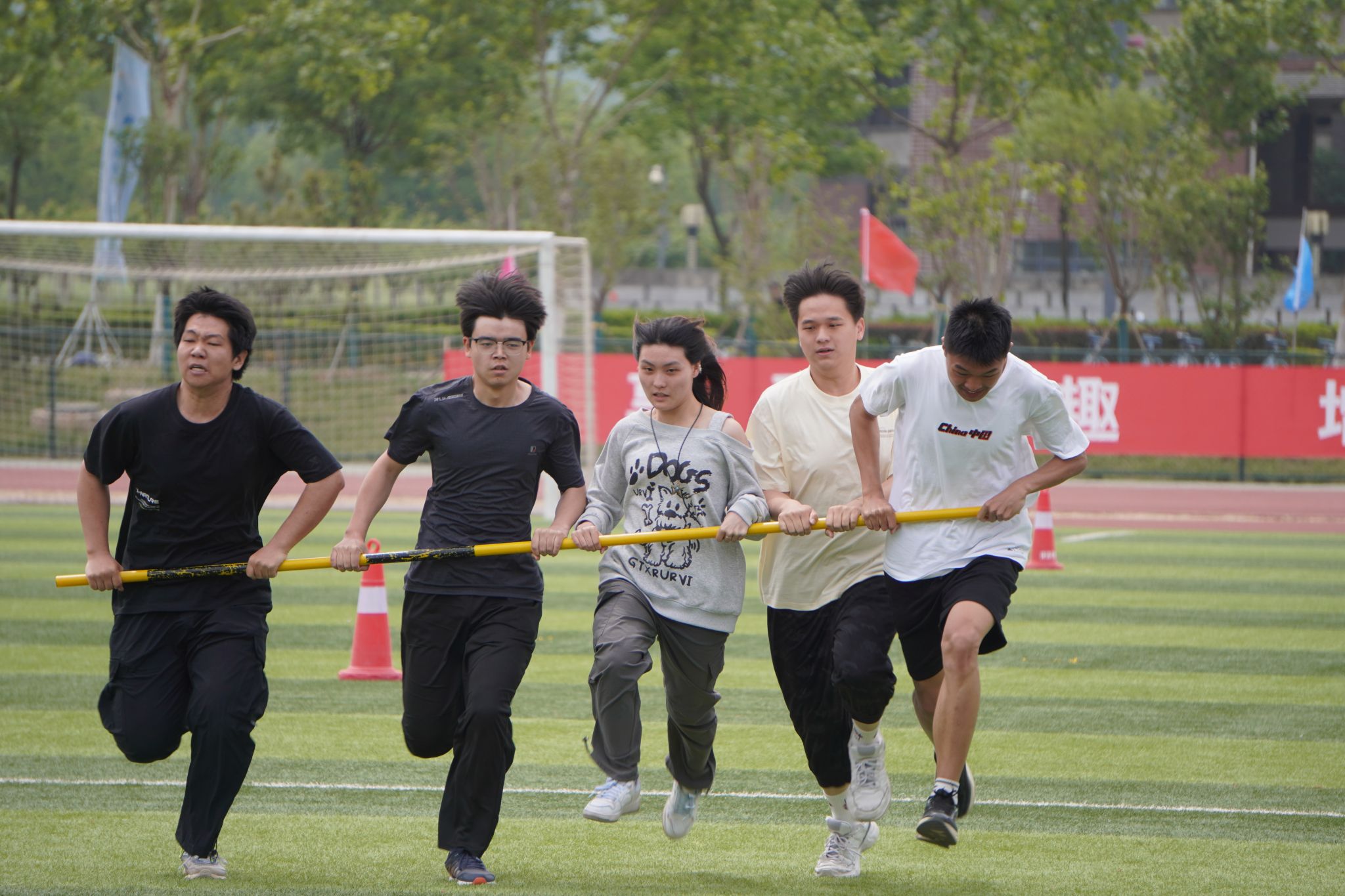 长杆紧握,默契交接,五人持杆用独特方式诠释城院的团结与坚持;旋臂、蓄力、迸发!垒球划过天际,是城交学子对“更高更远”的追求;交接棒划出银光,脚步与呐喊共振。加速,交接,冲刺,用速度诠释青春的热血锋芒;